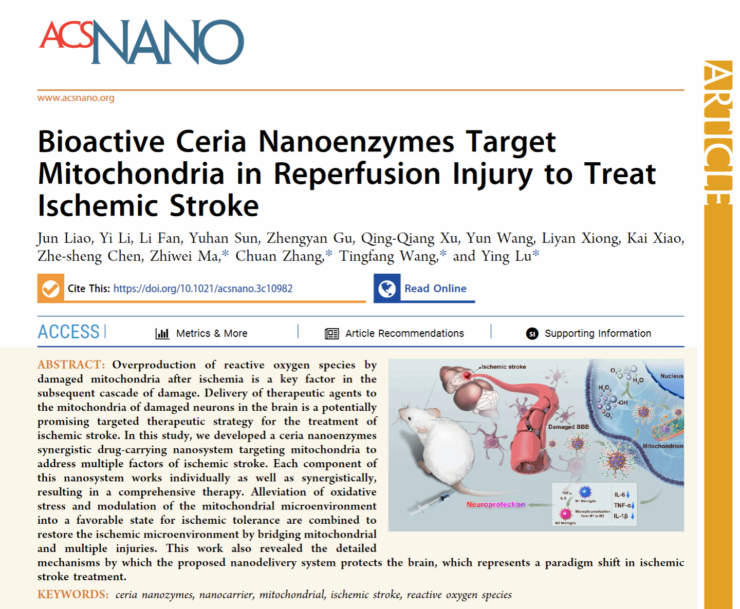 张川教授团队在美国化学会纳米科学领域旗舰期刊ACS NANO(中科院一区TOP期刊,IF=17.1)发表了题为Bioactive CeriaNanoenzymesTarget Mitochondria in Reperfusion Injury to Treat Ischemic Stroke的研究论文。