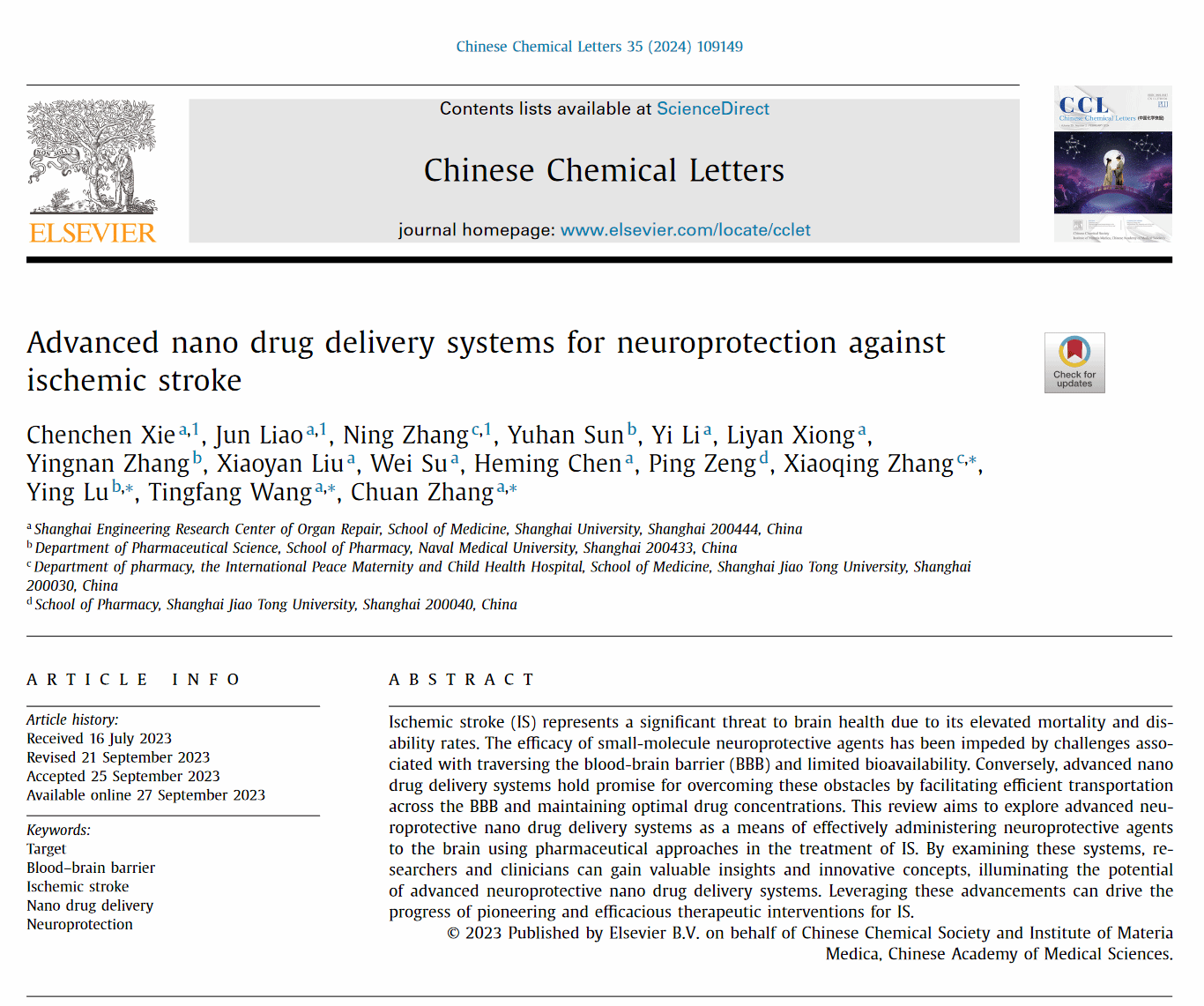 张川教授团队在中国化学会和中国医学科学院药物研究所联合主办,中国化学领域唯一的快报类期刊ChineseChemicalLetters(中科院一区TOP期刊,IF9.1)杂志上发表了题为Advanced nano drug delivery systems for neuroprotection against ischemic stroke研究综述论文。该文为张川教授团队2023年在药剂学领域国际知名期刊《Journal of Controlled release》上发表仿生纳米递送系统在脑部疾病的应用进展论文后,在缺血性脑卒中领域又一最新进展。