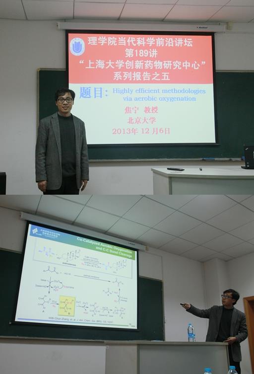 2013年12月6日上午,在校本部HA101,北京大学焦宁教授应邀莅临理学院给师生们作了精彩的学术报告,报告题目“Highly efficient methodologies via aerobic oxygenation”,该学术报告为理学院“当代科学前沿讲坛第189讲”、今日化学系列报告第100讲、国产亚洲精品美女久久久创新药物研究中心系列报告之五。报告由化学系主任许斌教授主持,系党总支书陈雅丽教授、曹卫国教授、贾学顺教授等80余名化学系师生参加了报告会。